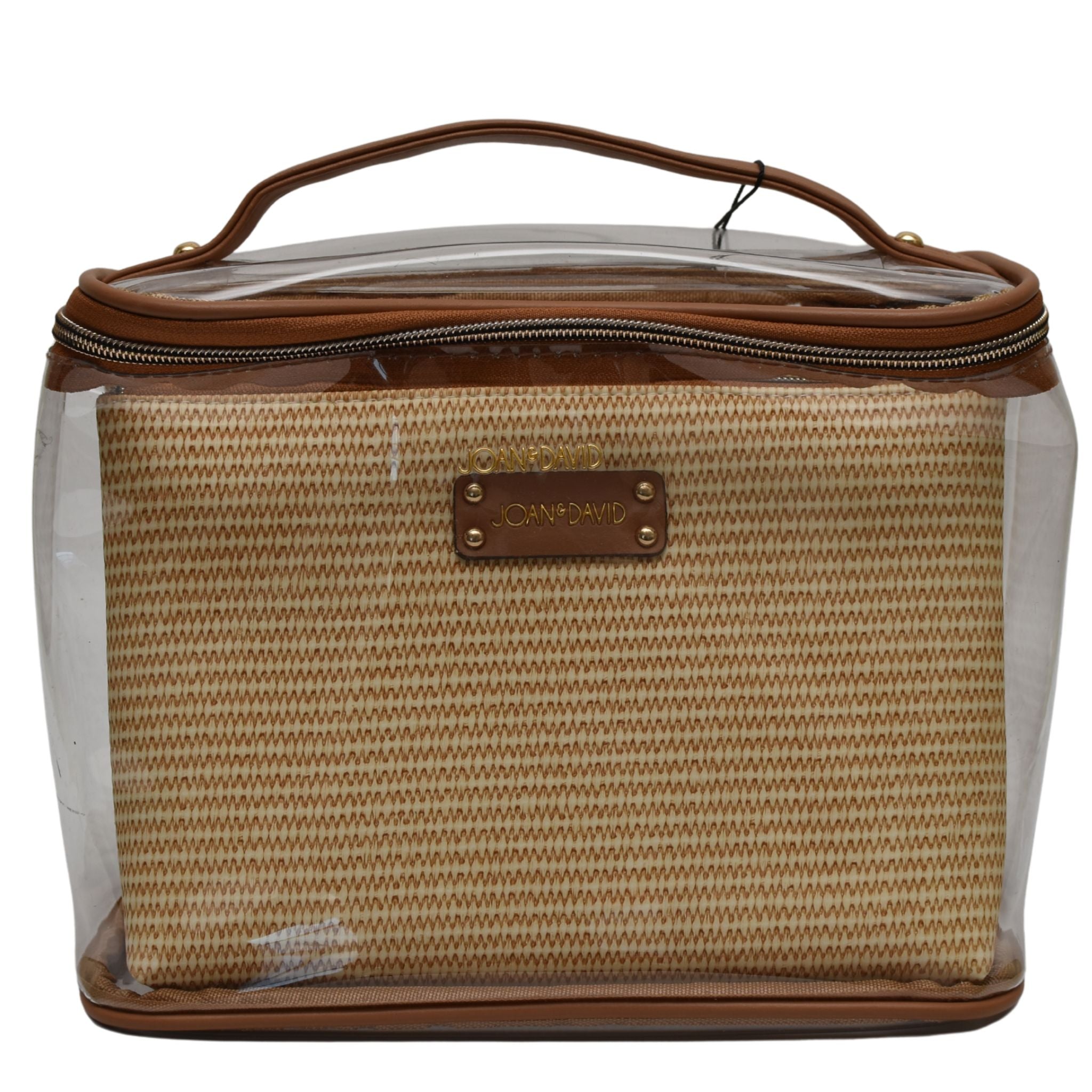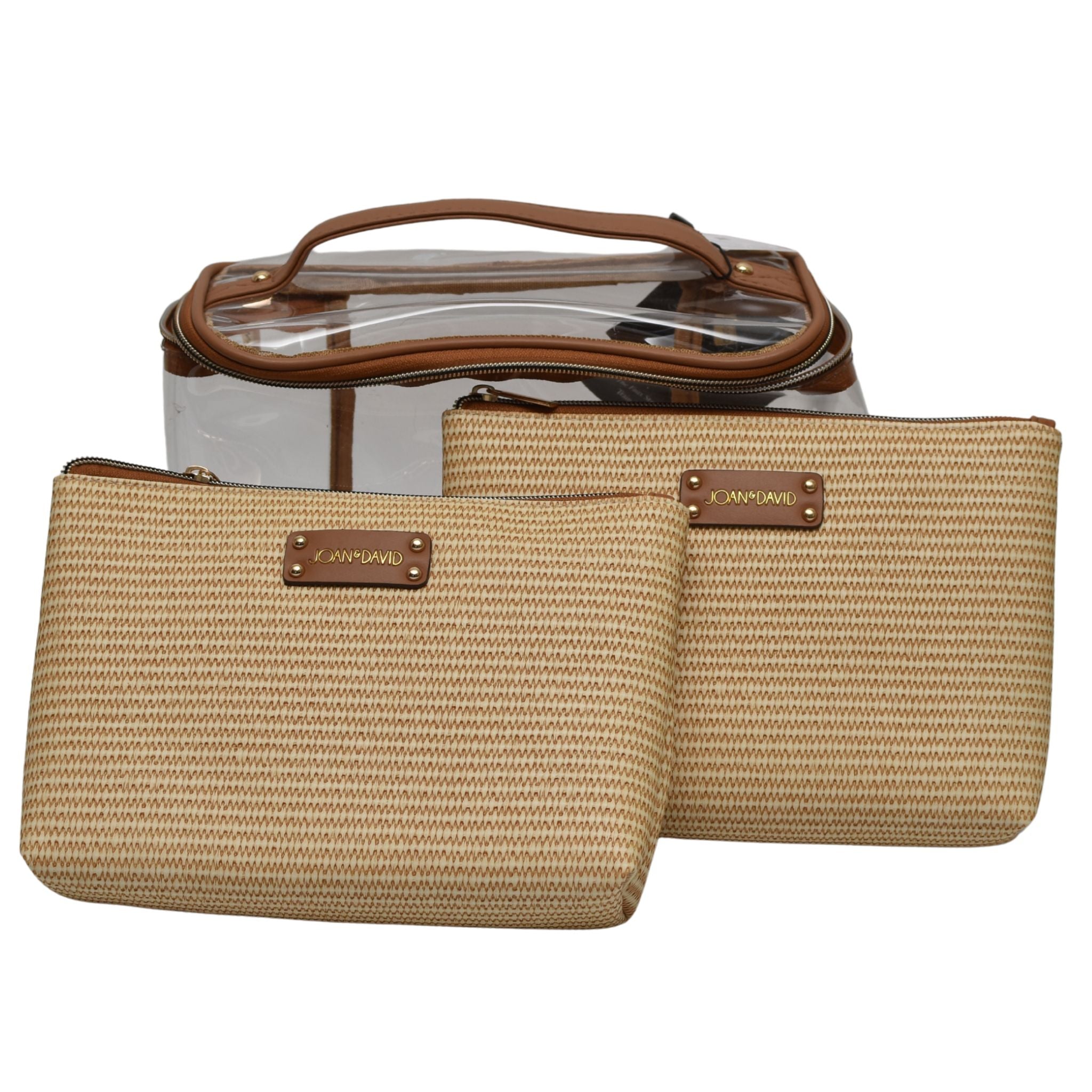This 3 Piece Faux Straw Cosmetic Train Case offers organized storage with a stylish natural tan trim, handle, and gold hardware. Inside the main case, two zippered pouches feature a faux straw print, providing versatile compartments to keep your beauty essentials neatly separated and easy to access. Perfect for travel or daily use, this set combines durable design with elegant, natural-inspired accents.