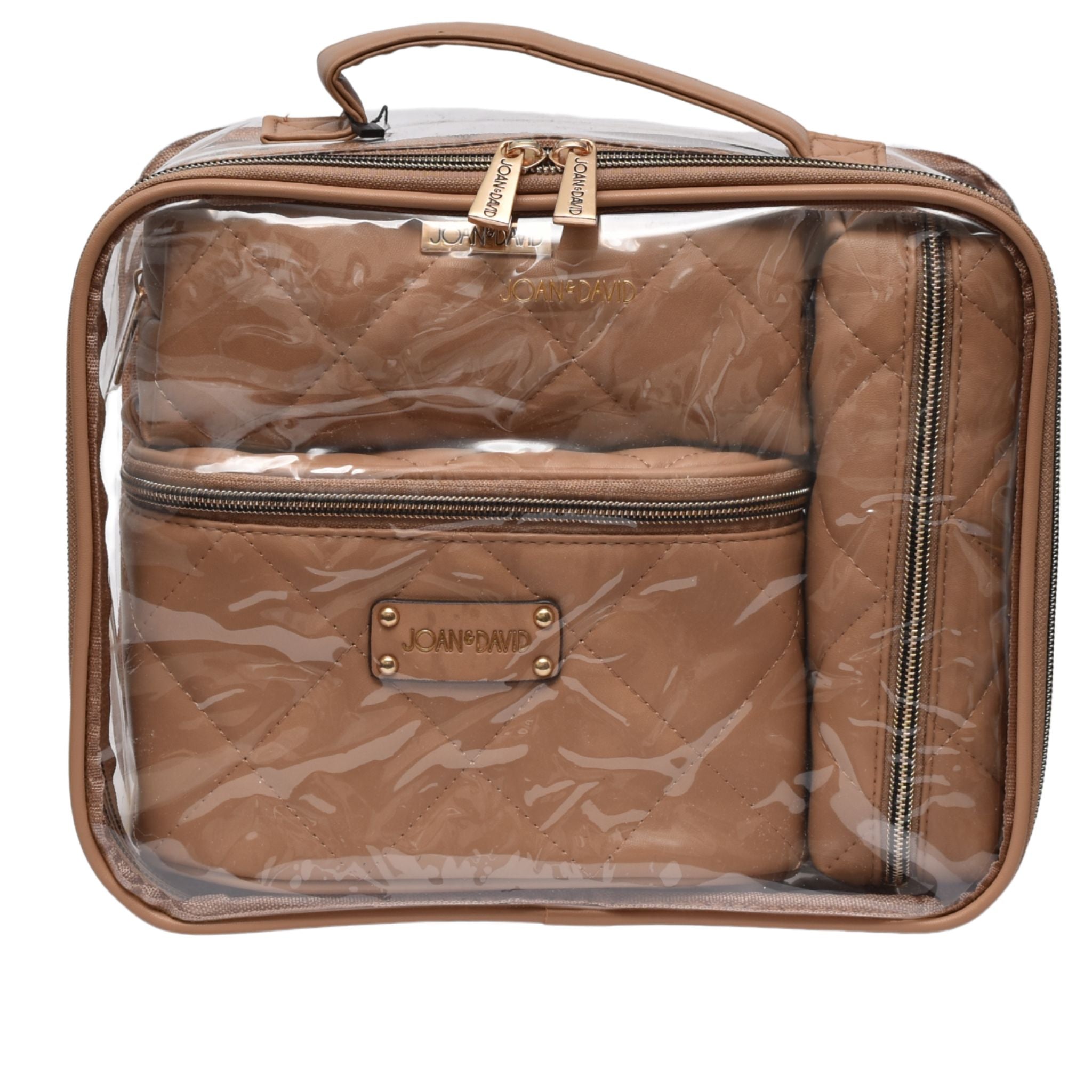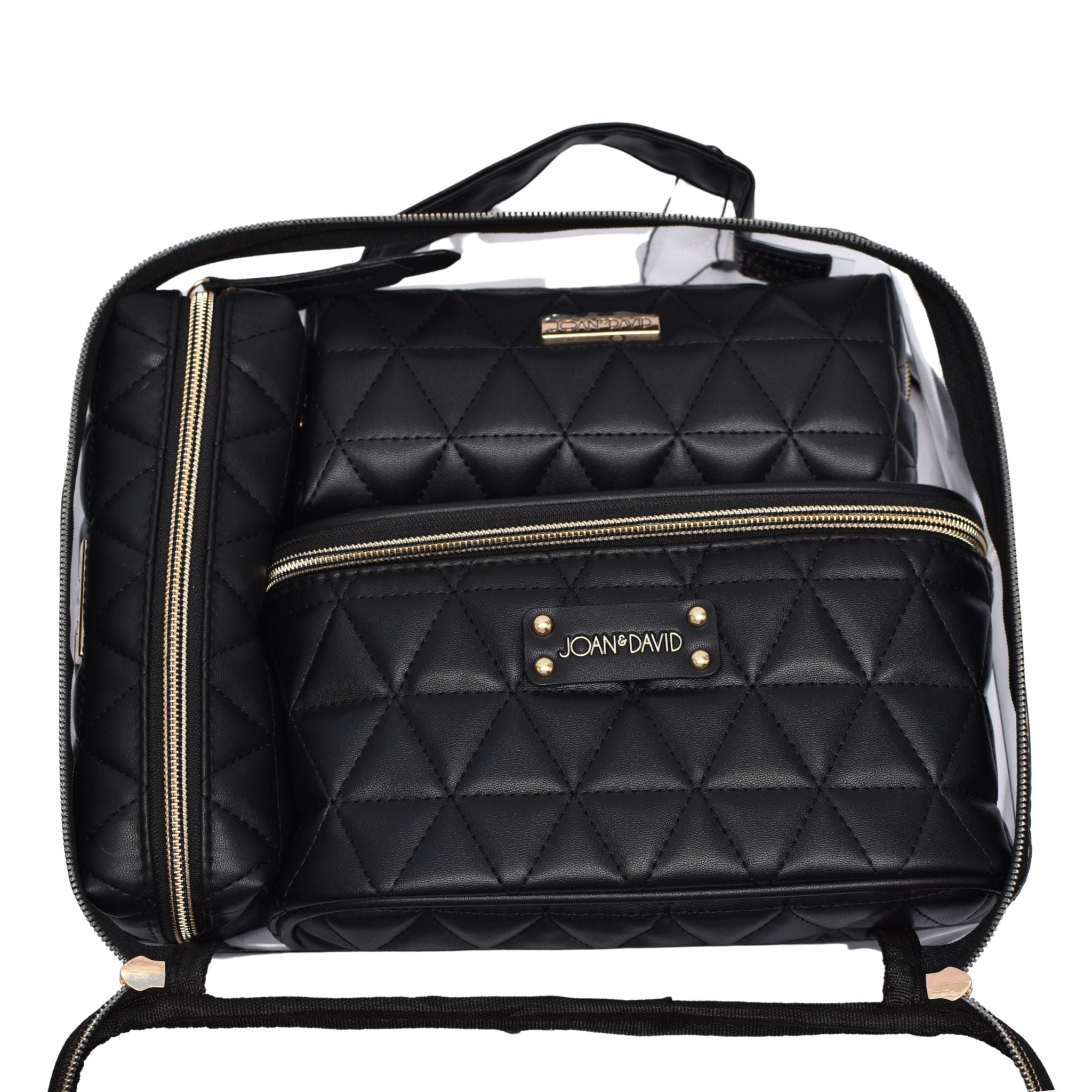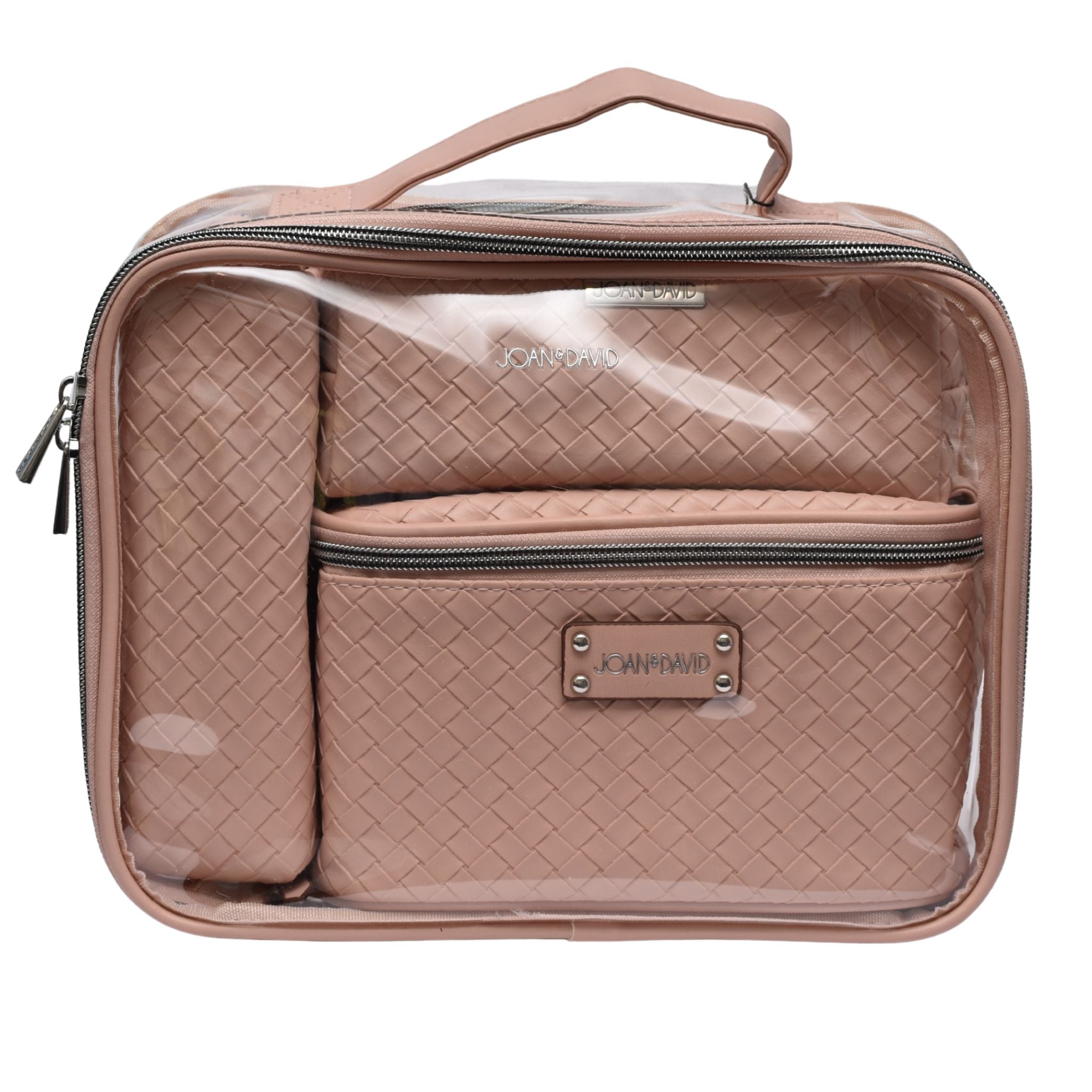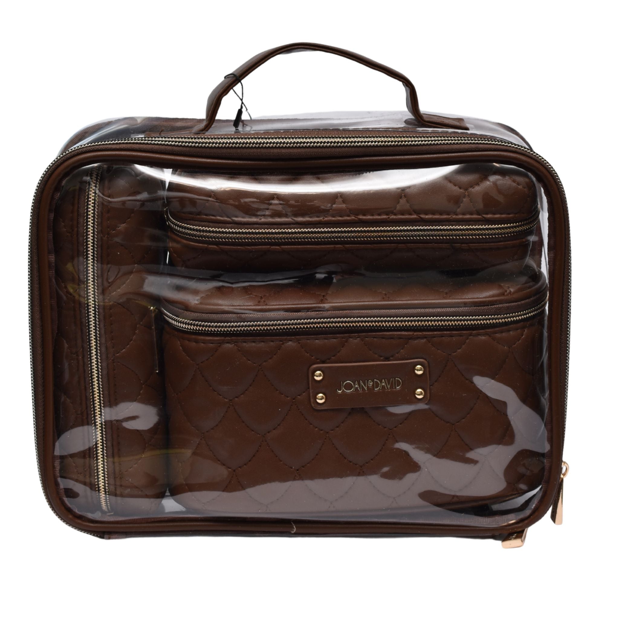 This elegant 4 Piece Cosmetic Set by Joan & David features a clear outer case with a handle that neatly stores three smaller cases: one small train case and two elongated zippered pouches. Designed to fit perfectly within the outer case, it offers sophisticated organization for all your essential toiletries, making travel and daily routines effortlessly stylish.