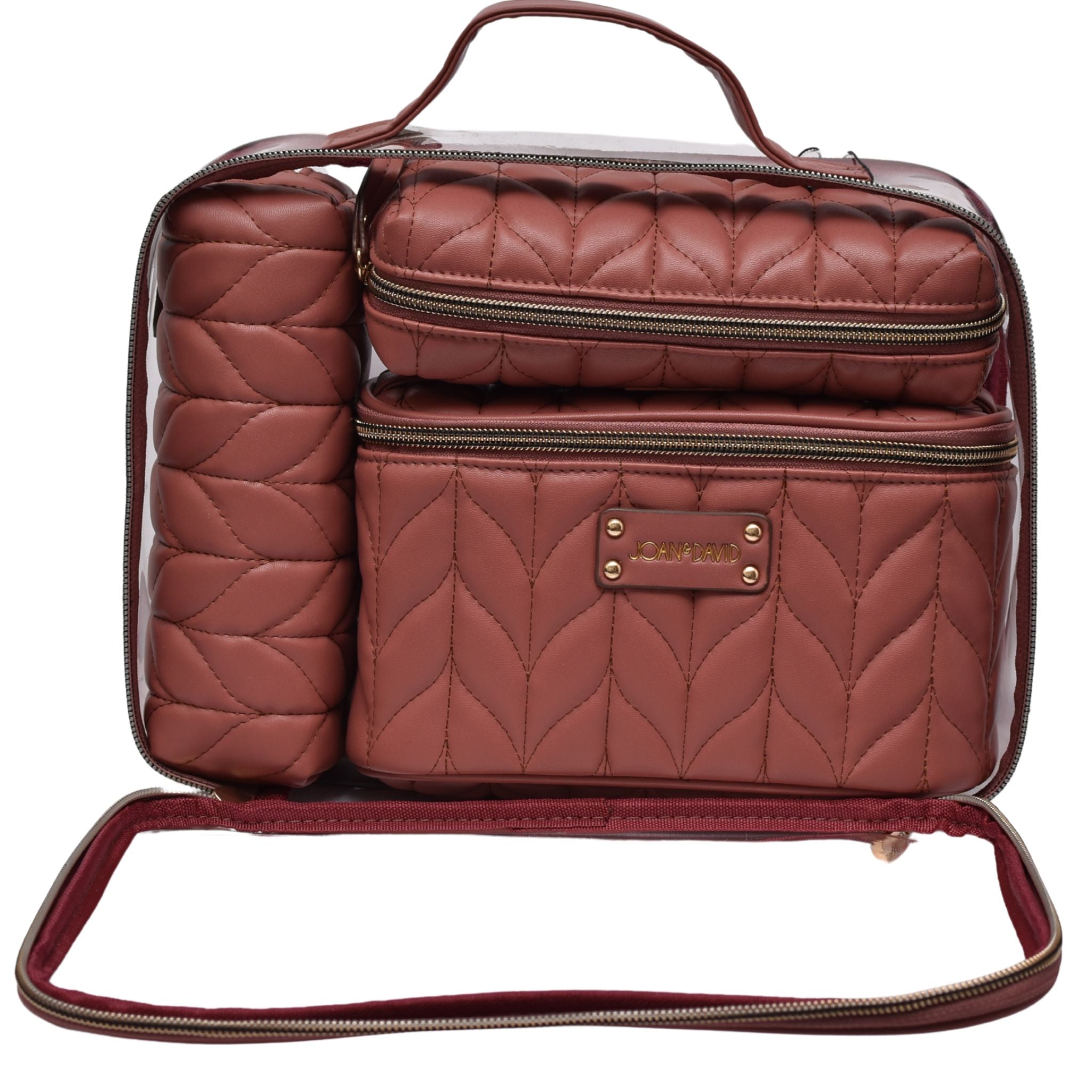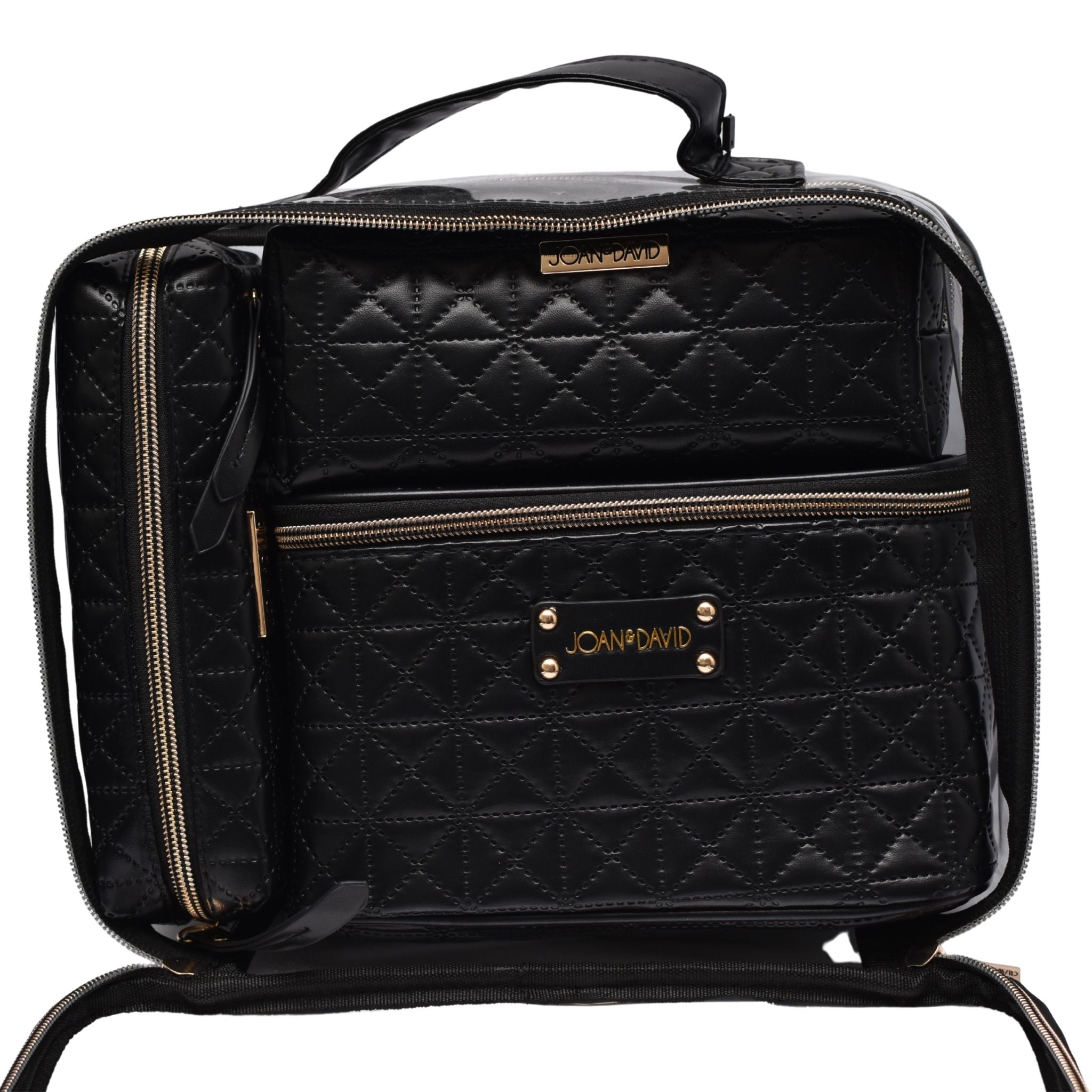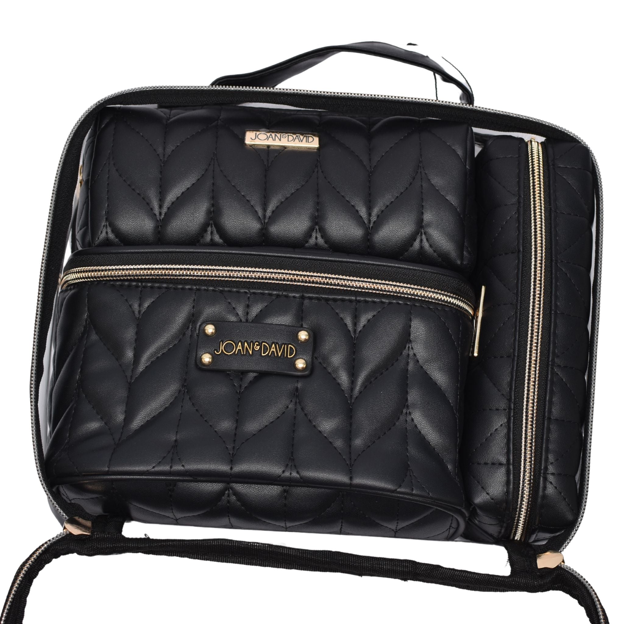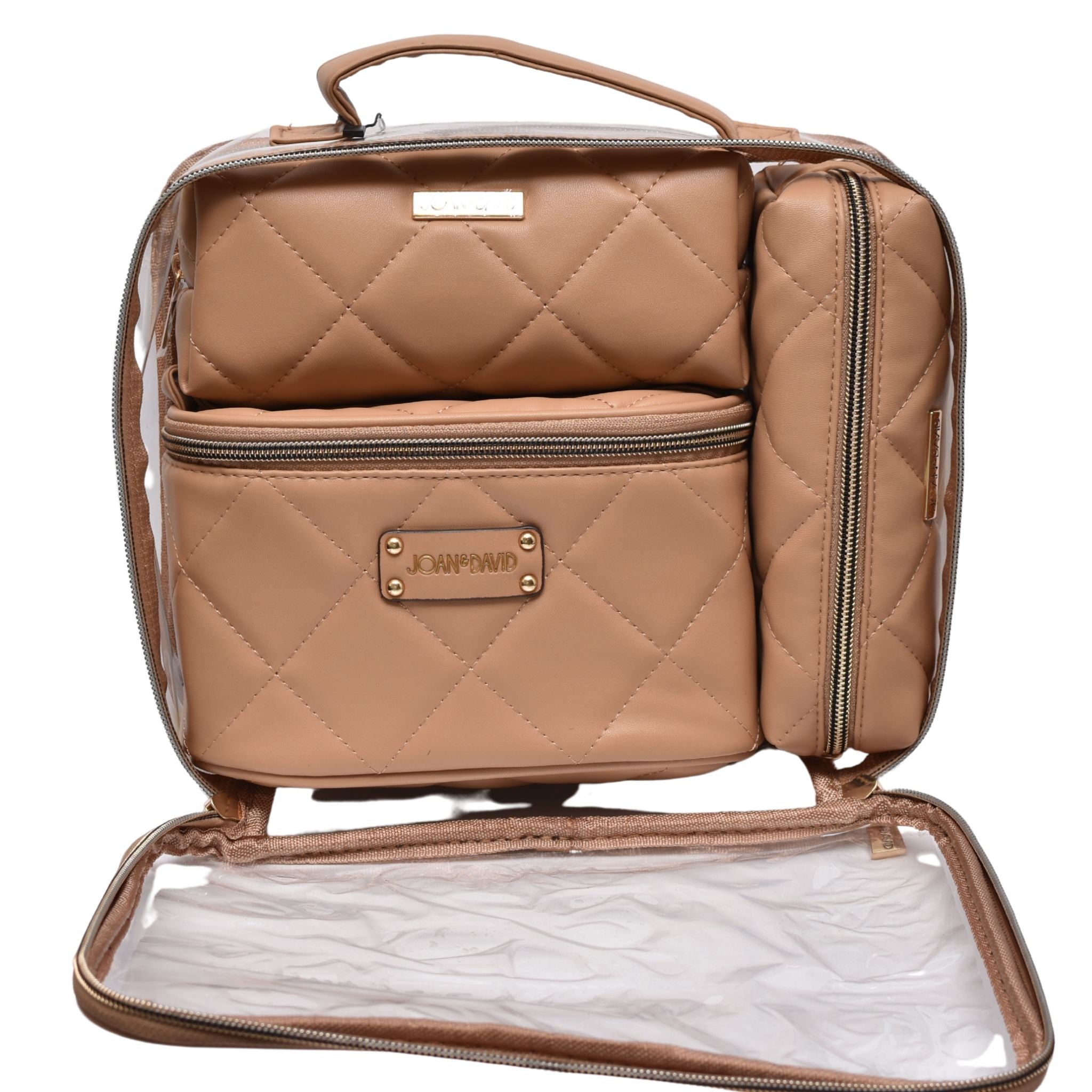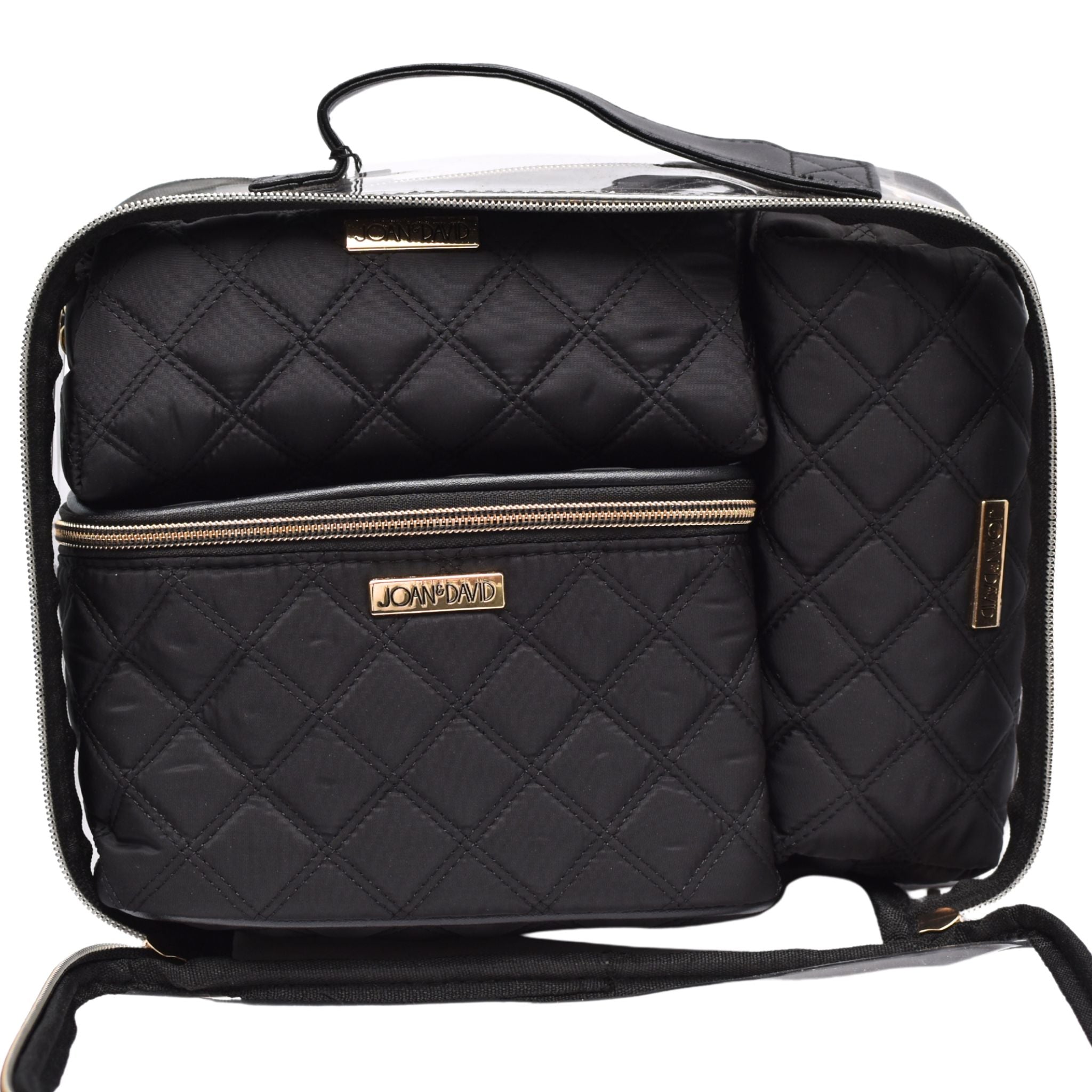 This elegant 4 Piece Cosmetic Set by Joan & David features a clear outer case with a handle that neatly stores three smaller cases: one small train case and two elongated zippered pouches. Designed to fit perfectly within the outer case, it offers sophisticated organization for all your essential toiletries, making travel and daily routines effortlessly stylish.