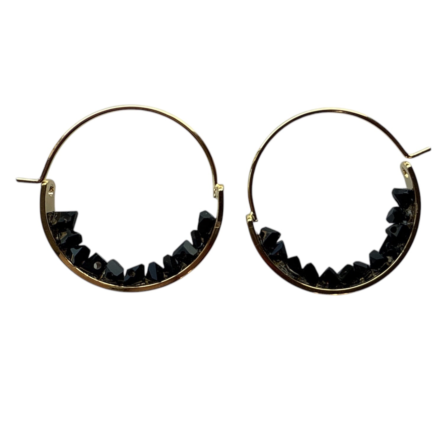 Elevate your style with the bold elegance of the Moving Mountains Hoop Earrings. These stunning hoops feature a unique design where the bottom inside is adorned with shimmering black crystals, artfully arranged to resemble a dramatic mountain range. The combination of the rugged, natural beauty of mountains and the sophisticated elegance of fine jewelry makes these earrings the perfect statement piece for any occasion.