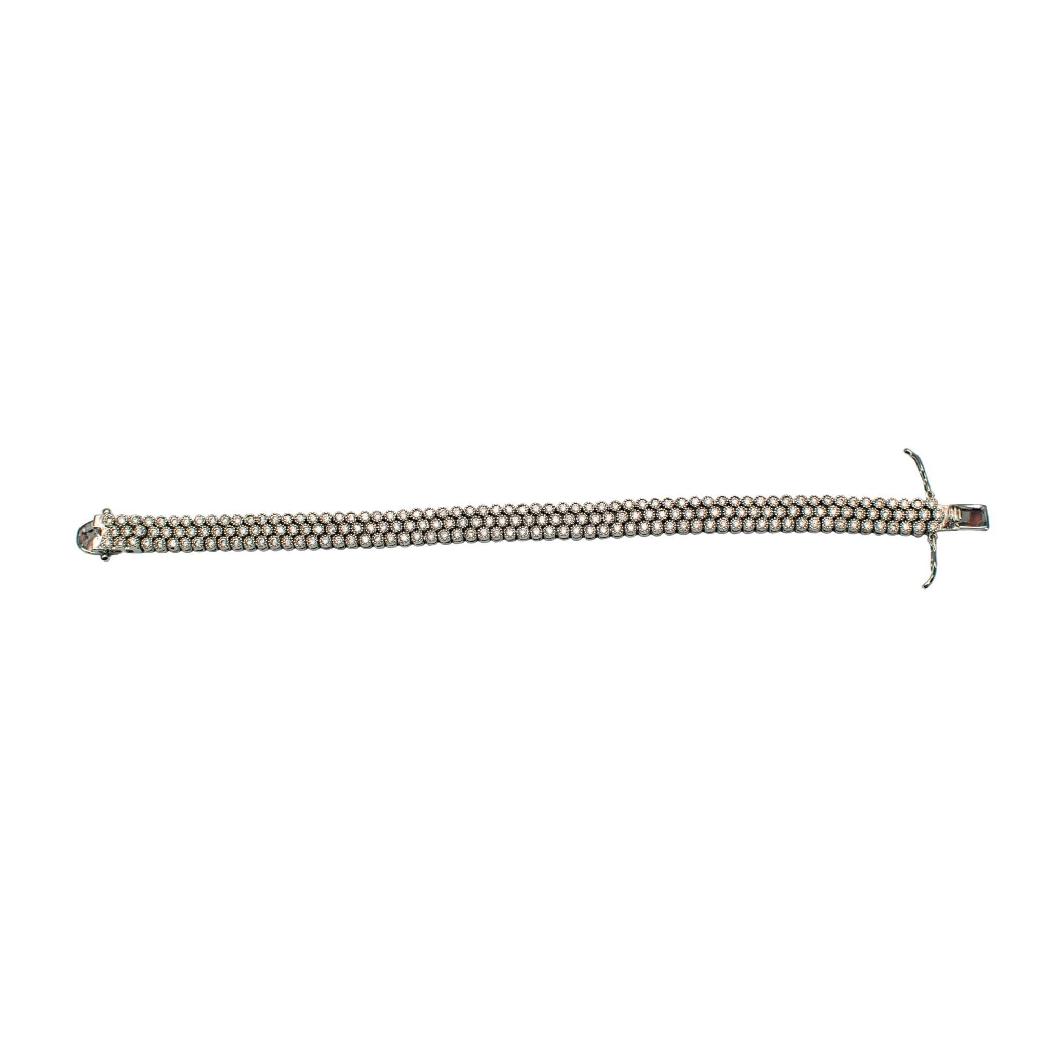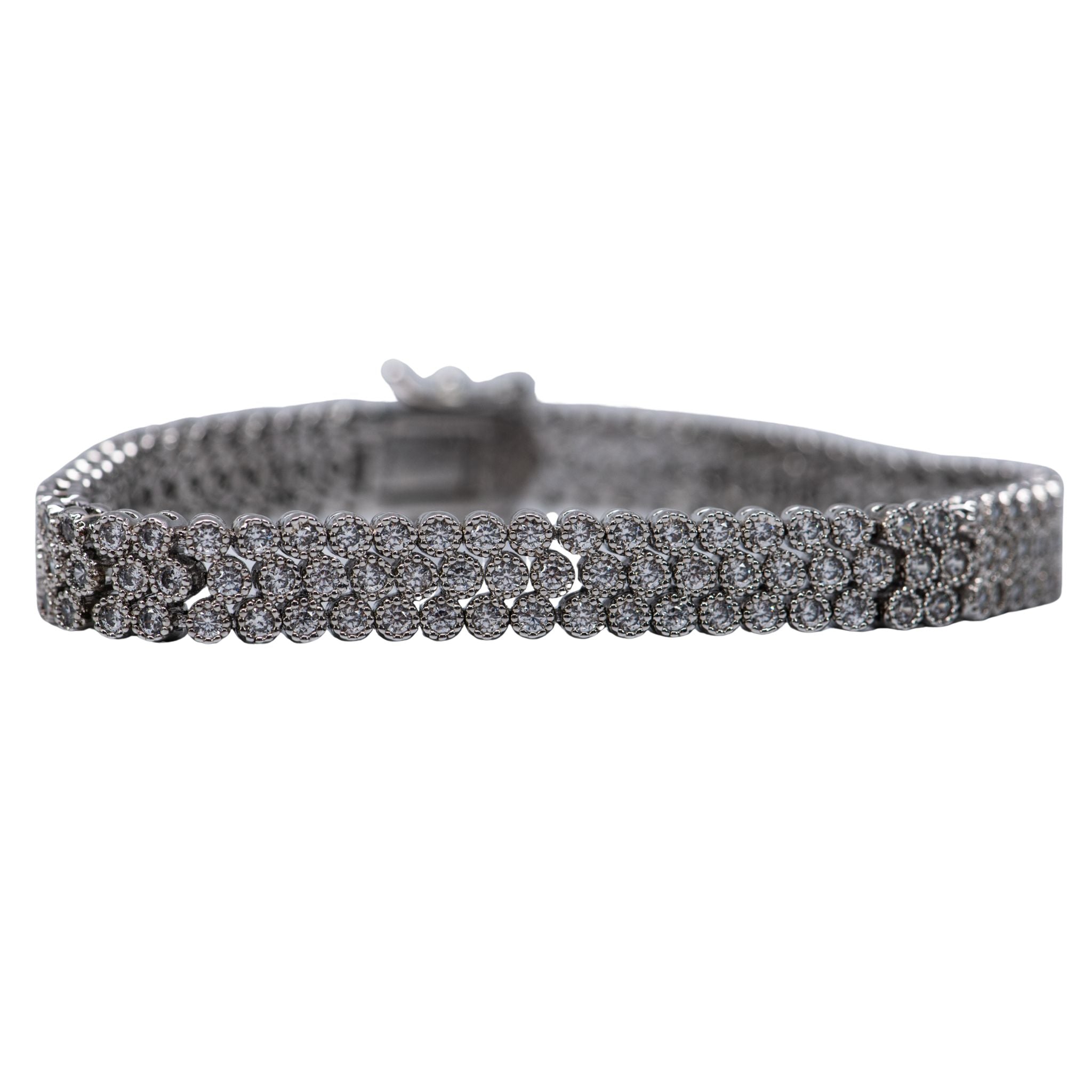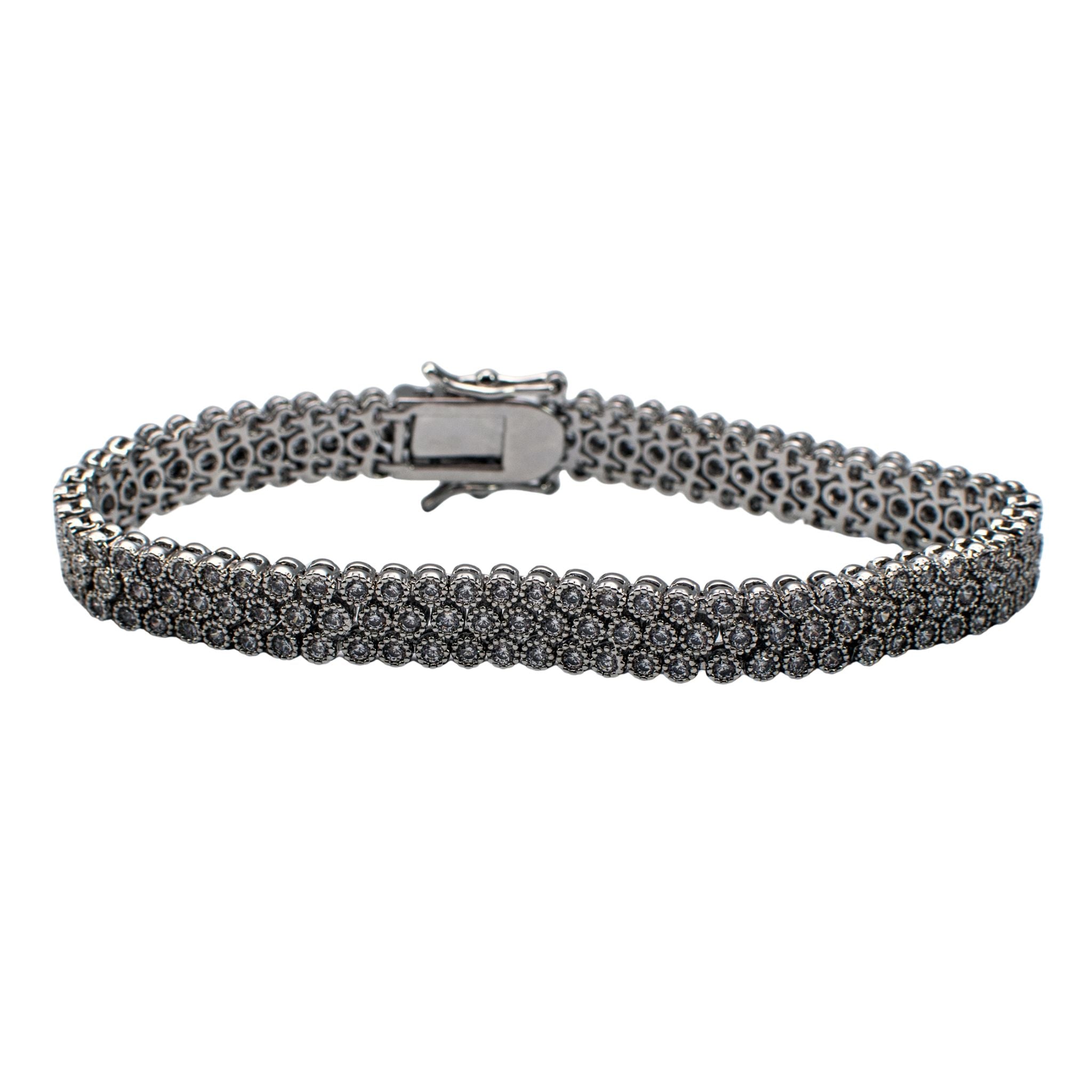 Make a statement with this stunning triple-row bracelet that's as versatile as you are. Featuring three rows of sparkling circular CZ stones set in a sleek silver base, this open-box design catches light from every angle. The secure closure keeps it perfectly in place, whether you're wearing it solo for maximum impact or layering it with your favorite pieces. At 8 inches, it's the ideal length for stacking or standing out on its own. Pure sparkle, pure fun.
