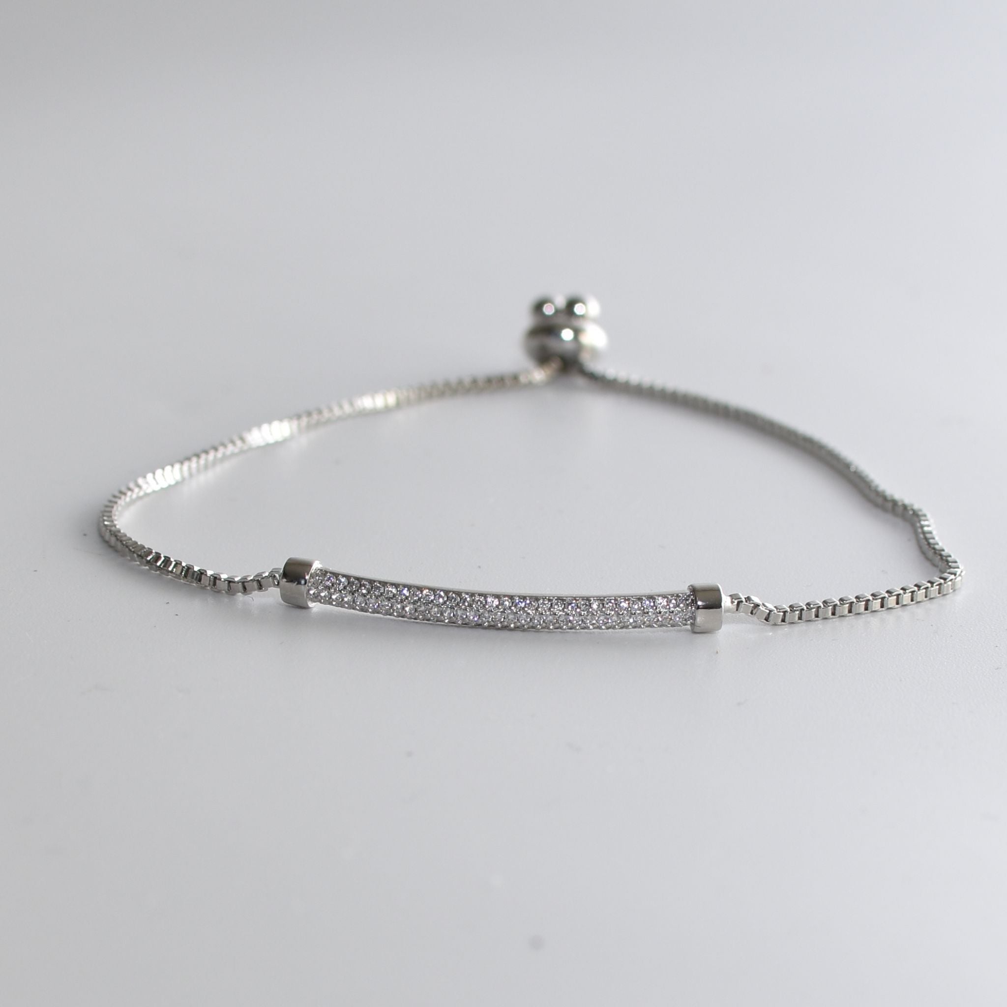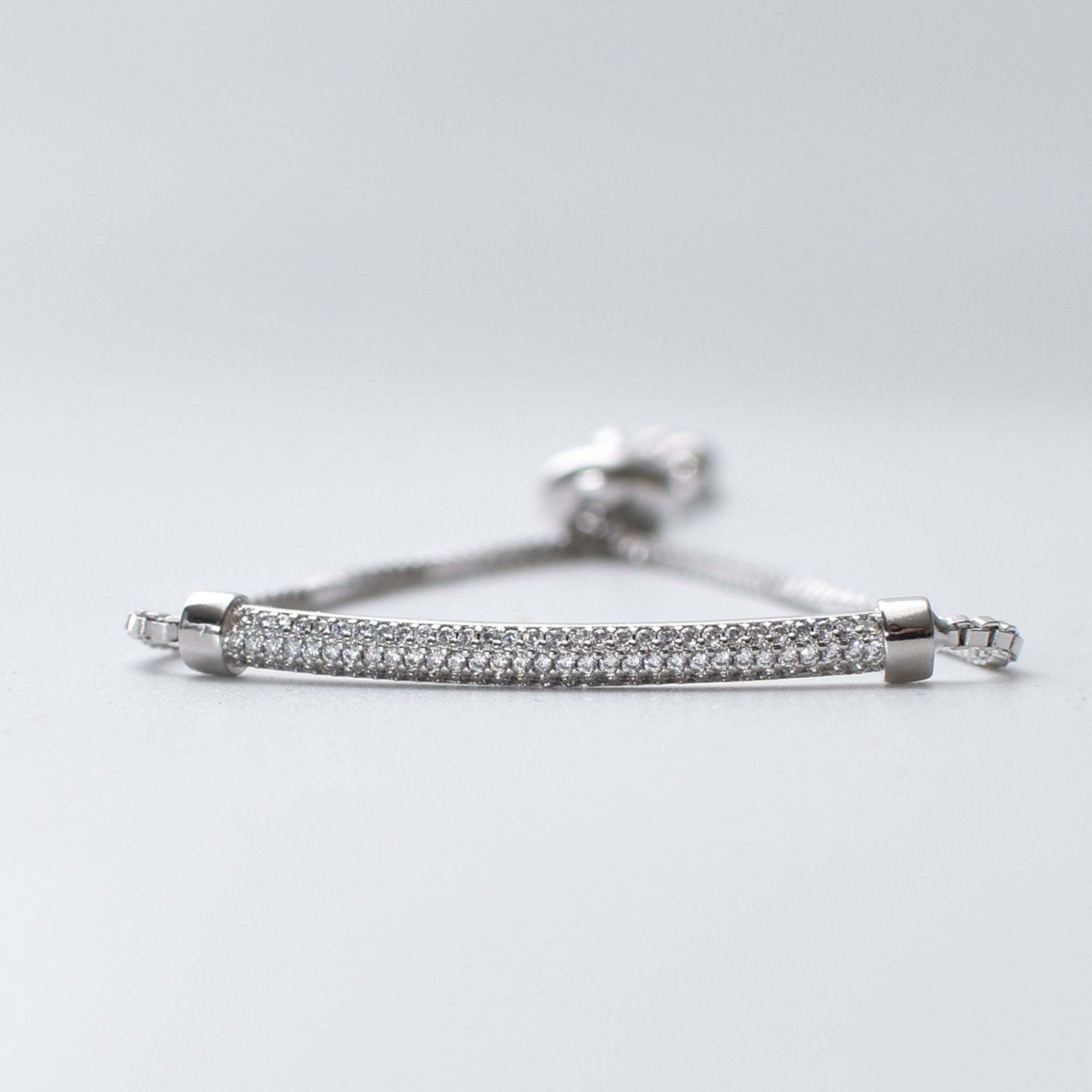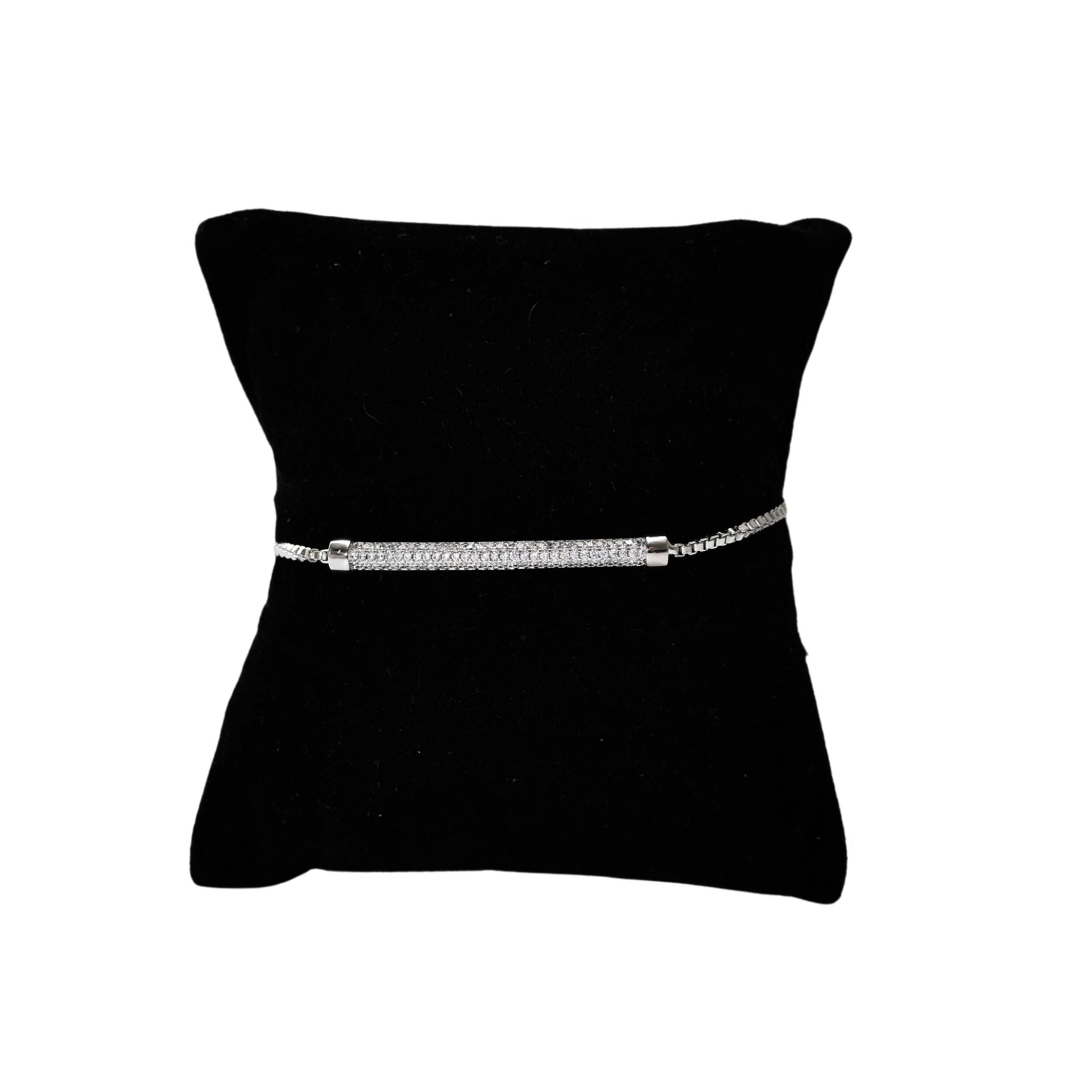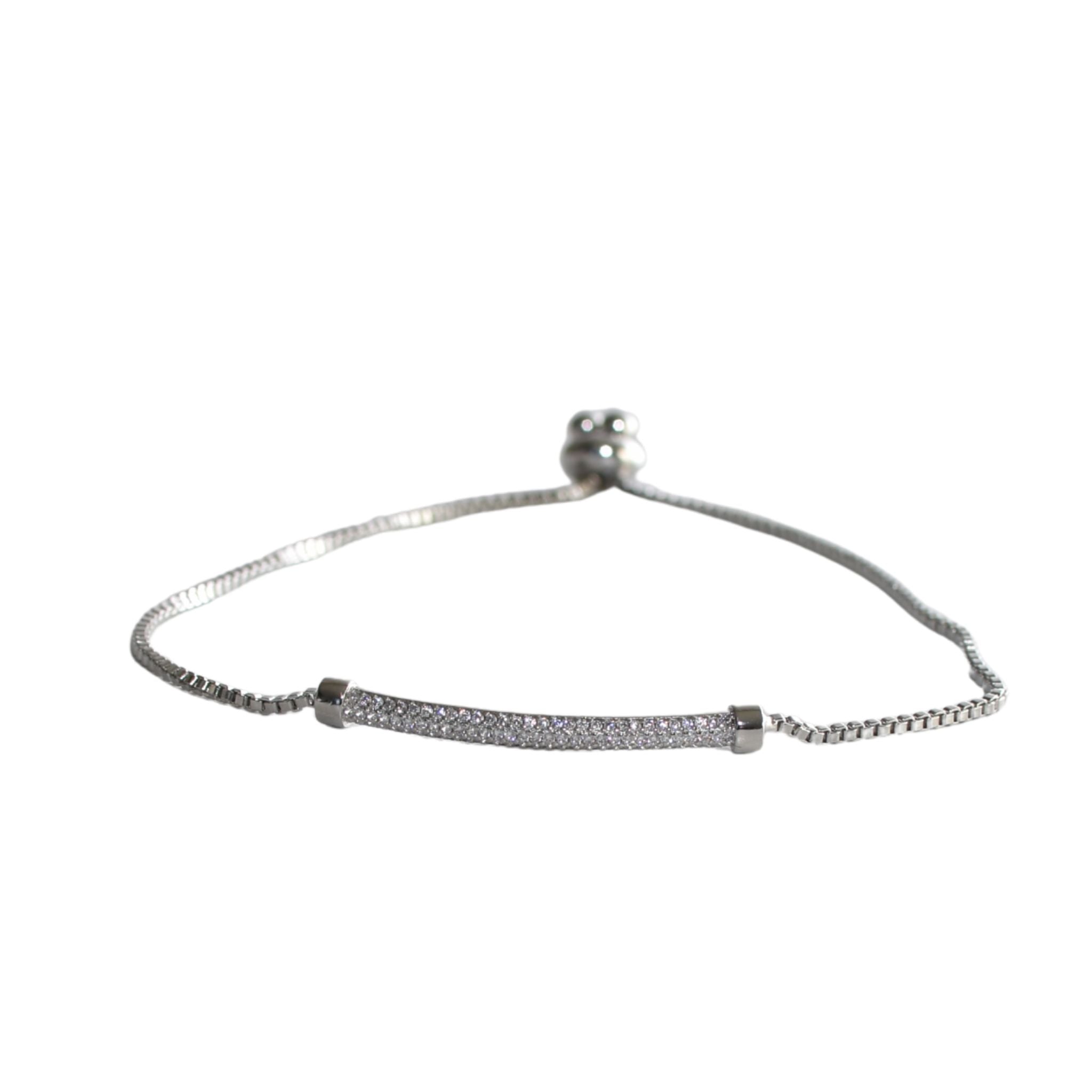 This adjustable silver bracelet features a sleek silver metal bar adorned with sparkling CZ stones, adding a refined touch to any outfit. Its size-ability ensures a comfortable fit for various wrist sizes, making it a versatile and elegant accessory for both everyday wear and special occasions. The combination of polished silver and dazzling stones offers lasting style and subtle sophistication.